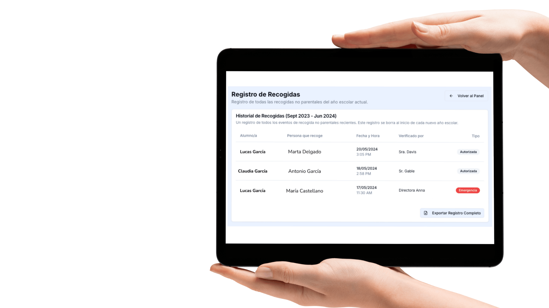 En el colegio, el profesor valida la recogida y tú recibes una notificación instantánea confirmando que todo ha ido bien. Sabiendo a que hora han recogido al menor y quien lo ha hecho.