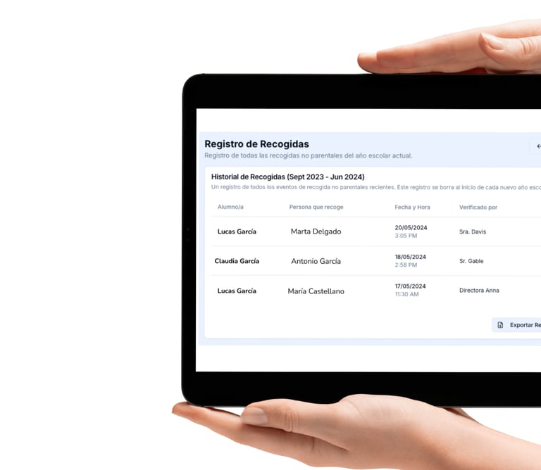 Accede al historial completo de recogidas de tu hijo de forma instantánea y desde cualquier lugar. Con RecoKids, toda la información queda registrada automáticamente cada vez que tu menor es recogido del centro educativo, creando un archivo detallado y siempre actualizado.